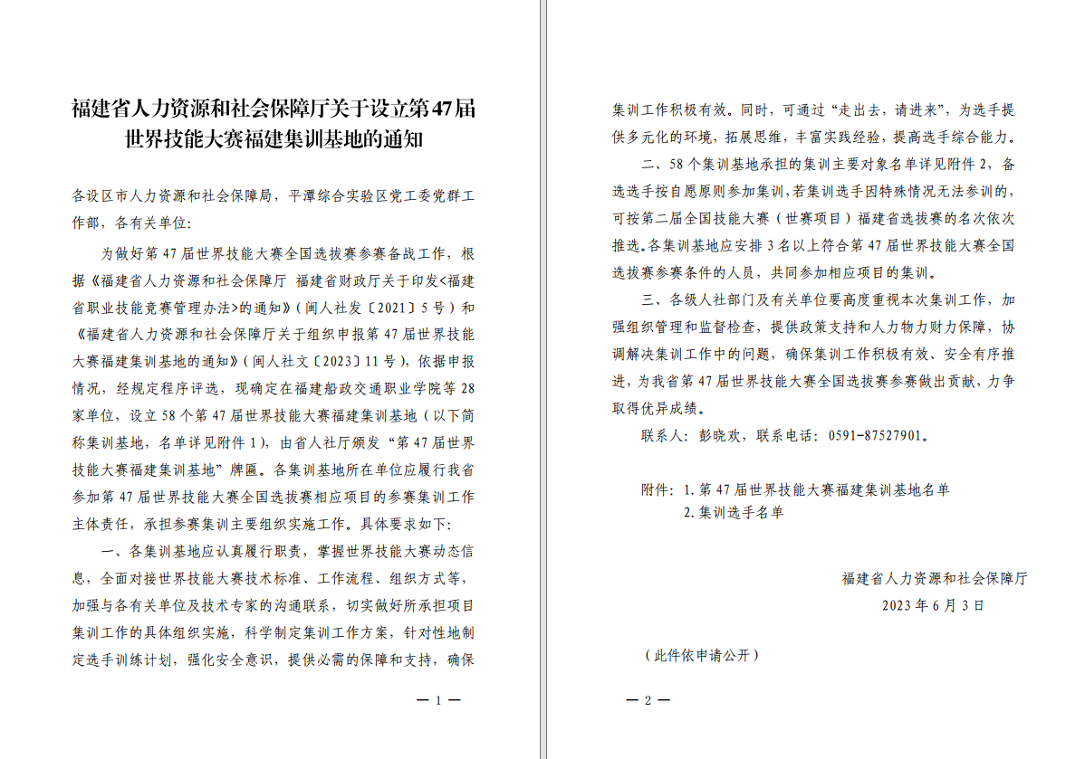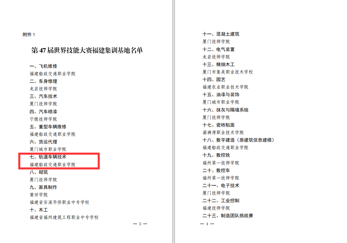 根據(jù)《福建省人力資源和社會保障廳福建省財政廳關(guān)于印發(fā)<福建省職業(yè)技能競賽管理辦法>的通知》(閩人社發(fā)〔2021〕5號)和《福建省人力資源和社會保障廳關(guān)于組織申報第47屆世界技能大賽福建集訓(xùn)基地的通知》(閩人社文〔2023〕11號)文件,我院入選第47屆世界技能大賽“軌道車輛技術(shù)”賽項福建集訓(xùn)基地。
