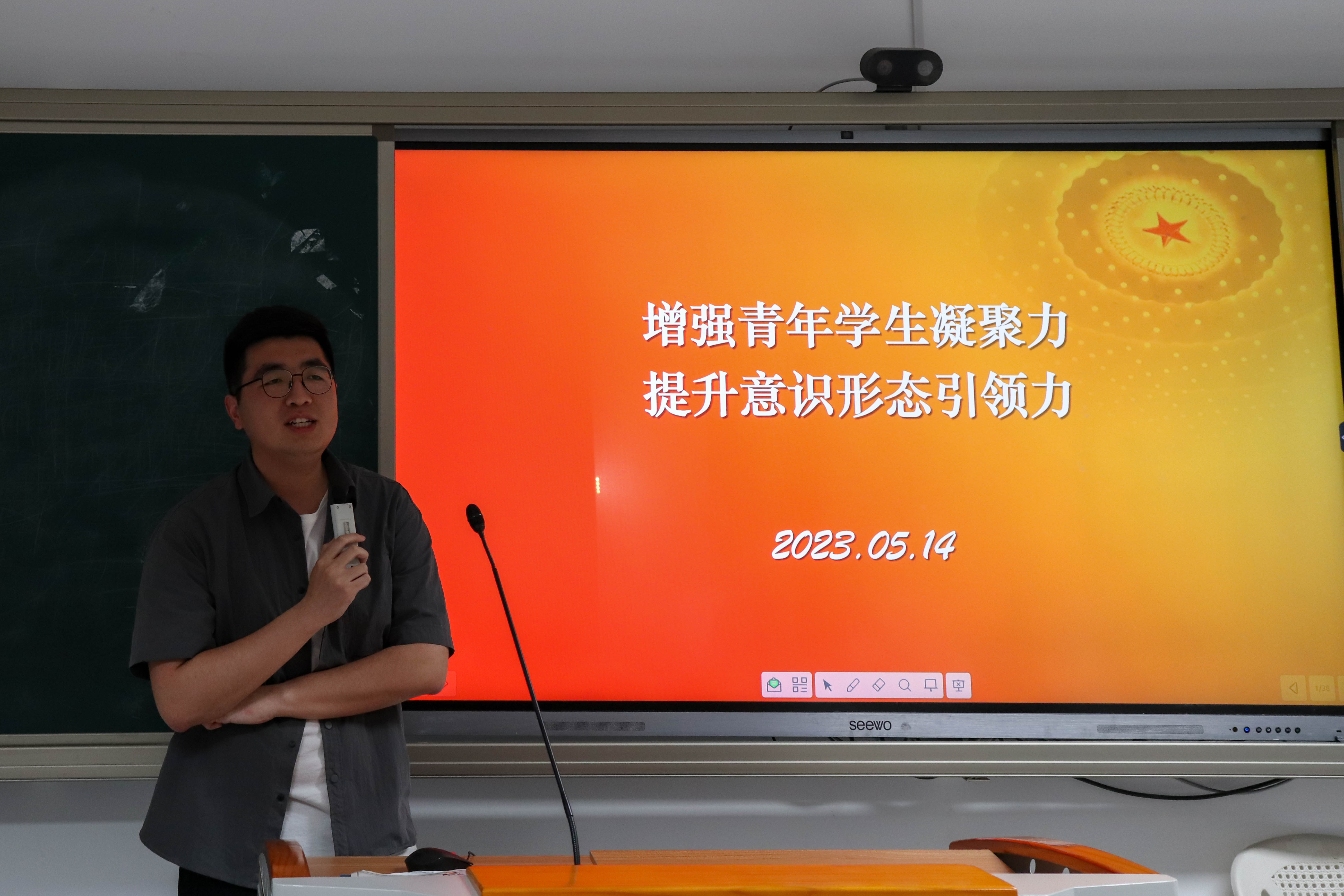 繆宇彬輔導員向大家解讀了新時代高校提升意識形態(tài)凝聚力和引領力建設的多維邏輯。他指出,黨的二十大報告全面總結意識形態(tài)領域發(fā)生的全局性、根本性轉(zhuǎn)變,深刻分析面對的風險挑戰(zhàn),強調(diào)“要建設具有強大凝聚力和引領力的社會主義意識形態(tài)”。高校是理論研究和理論創(chuàng)新的重要陣地,是培養(yǎng)青年人才的搖籃,加強意識形態(tài)建設至關重要。
