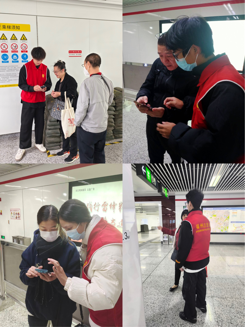 我院志愿者在福州各個地鐵站進行旅客疏導服務活動。主要幫助地鐵站疏導行進的旅客、維持站內(nèi)秩序,幫助不熟悉候車室位置的旅客找到正確的地點。