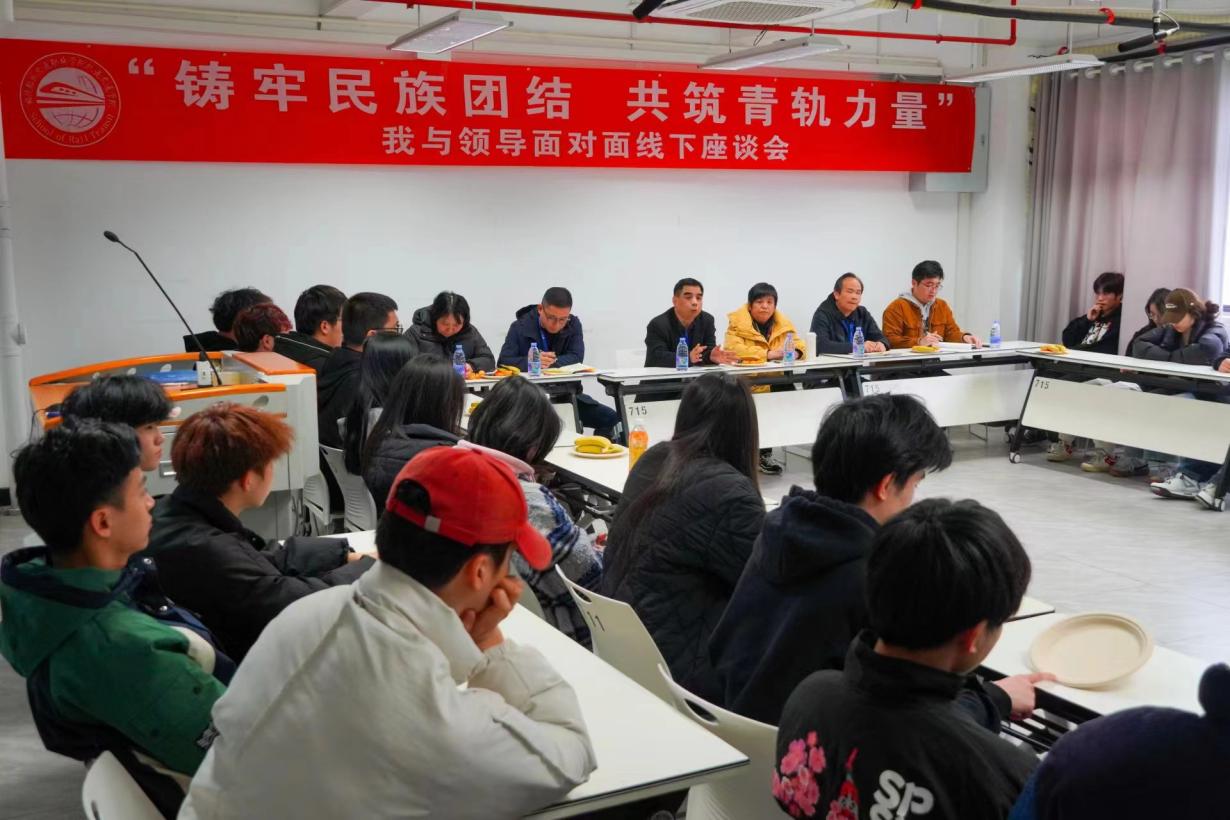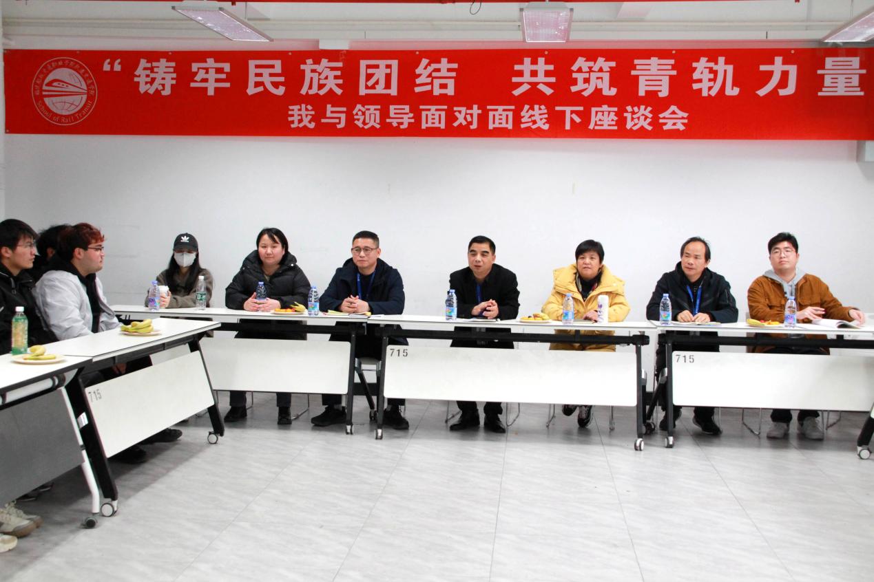 為引導(dǎo)學(xué)生樹立正確的人生觀、價(jià)值觀、世界觀,加強(qiáng)愛國主義教育,鑄牢中華民族共同體意識(shí),軌道交通學(xué)院利用春季開學(xué)的重要契機(jī),于2024年3月13日開展“鑄牢民族團(tuán)結(jié),共筑青軌力量”我和領(lǐng)導(dǎo)面對(duì)面線下座談會(huì)。參加本次座談會(huì)的有軌道交通學(xué)院黨總支書記孫基,副院長陳宏意,副院長季芳,組織員劉明,輔導(dǎo)員黃華梅、繆宇彬、陳凌靜以及各少數(shù)民族同學(xué)代表。