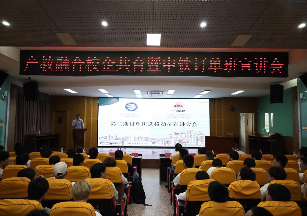 最后,進行第二屆訂單班選拔動員。中鐵二十四局集團福建鐵路建設(shè)有限公司陳熙副部長為第二屆訂單班進行動員宣講。