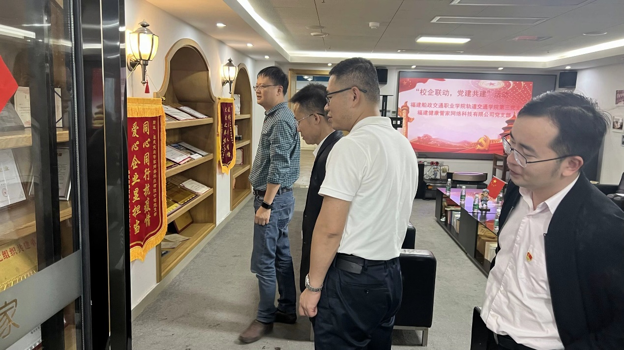 隨后,軌道交通學(xué)院第三黨支部成員參觀了福建健康管家網(wǎng)絡(luò)科技有限公司黨支部黨建工作室,聽取了公司黨支部“134+”黨建模式的結(jié)構(gòu)設(shè)計理念和實施進展,并就公司研發(fā)的醫(yī)療設(shè)備裝載高速列車進行旅客健康監(jiān)測和診療的可行性進行了熱烈的討論。