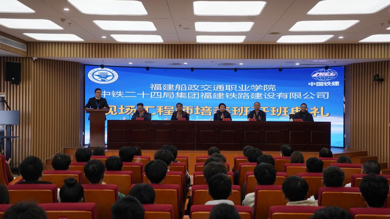 為進一步貫徹落實《教育部辦公廳等五部門關(guān)于實施職業(yè)教育現(xiàn)場工程師專項培養(yǎng)計劃的通知》文件精神,加快培養(yǎng)更多適應(yīng)新技術(shù)、新業(yè)態(tài)、新模式的高素質(zhì)技術(shù)技能人才,2025年1月2日下午,由福建船政交通職業(yè)學(xué)院主辦的中鐵二十四局集團福建鐵路建設(shè)有限公司現(xiàn)場工程師培養(yǎng)班開班典禮在福建船政交通職業(yè)學(xué)院順利舉行。福建船政交通職業(yè)學(xué)院黨委副書記張輝、中鐵二十四局集團福建公司副總經(jīng)理(兼總工程師)林劍忠、黨委干部部(人力資源部)副部長王燁、軌道交通學(xué)院黨政領(lǐng)導(dǎo)、項目有關(guān)教師和現(xiàn)場工程師班全體學(xué)員出席典禮,開班典禮由軌道交通學(xué)院副院長主持。