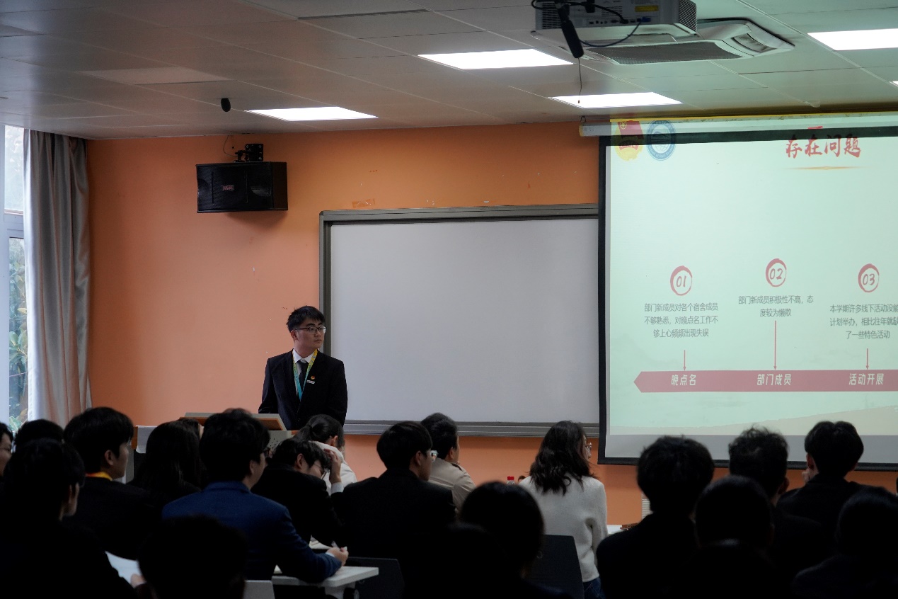 軌道交通學(xué)院分團(tuán)委志愿者工作部部長(zhǎng)辜海峰,對(duì)本學(xué)期部門開(kāi)展的常態(tài)化活動(dòng),項(xiàng)目及成績(jī)展示,以及未來(lái)規(guī)劃進(jìn)行敘述。輔導(dǎo)員也提出了更好的建議,對(duì)部門發(fā)展充滿期待。