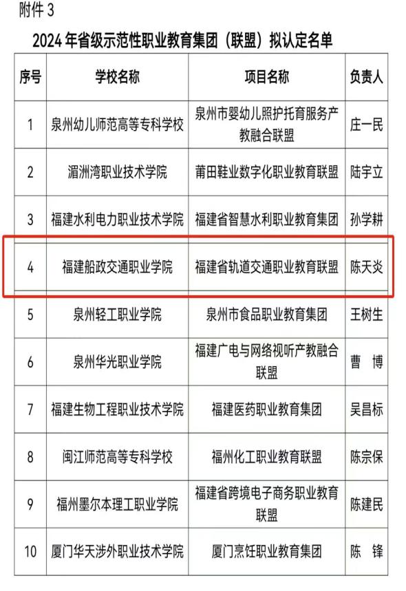 近日,福建省教育廳公布《2024年省級職業(yè)教育重點項目擬認定名單》,由我院牽頭組建的福建省軌道交通職業(yè)教育聯(lián)盟被認定為2024年省級示范性職業(yè)教育聯(lián)盟。