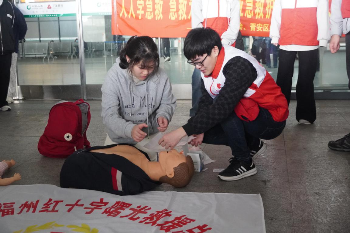 福州站內(nèi),軌道交通學(xué)院紅十字會(huì)的志愿者為旅客開展沉浸式急救培訓(xùn)。通過模擬心肺復(fù)蘇、止血包扎、海姆利克急救等場景,志愿者們將專業(yè)急救知識(shí)轉(zhuǎn)化為通俗易懂的實(shí)操教學(xué),將急救知識(shí)傳播給旅客們。