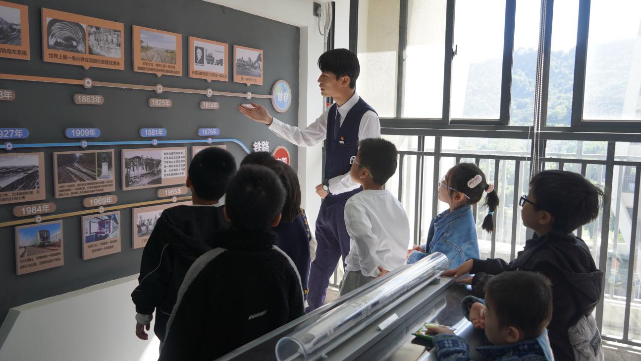 2024 年 11 月 29 日,我院與軌道交通協(xié)會共同舉辦了禮儀講解志愿服務活動。活動中,小朋友們在講解員的帶領下走進城市軌道發(fā)展歷程展示室。他們圍在展示板前,專注地聆聽著軌道交通的歷史。展示板上詳細記錄了世界和中國軌道交通的關鍵發(fā)展節(jié)點,孩子們眼中閃爍著好奇與求知的光芒,仿佛穿梭在時光隧道中,感受著軌道交通從無到有、從簡單到復雜的演變過程。