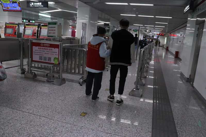 志愿者們對(duì)有大件行李的旅客進(jìn)行行李分擔(dān),引導(dǎo)他們走垂直電梯,排除安全隱患,志愿者還對(duì)盲人旅客進(jìn)行專人引導(dǎo),保證盲人也能像正常人一樣,享受地鐵的便捷。