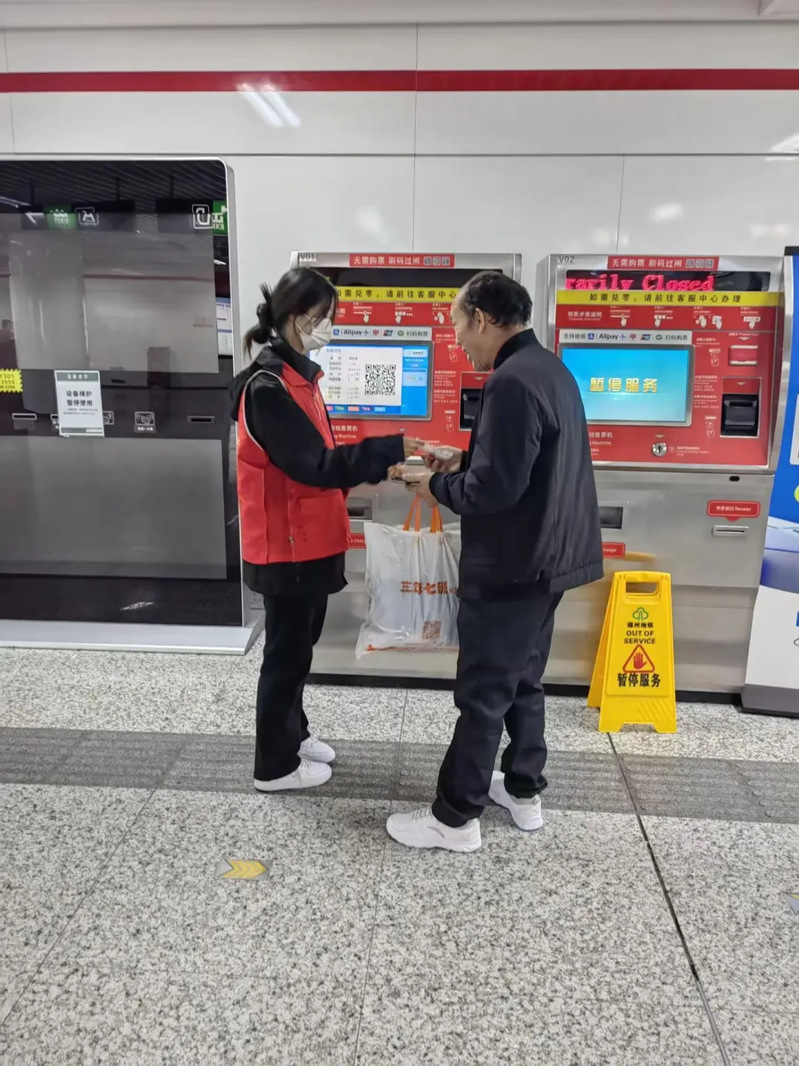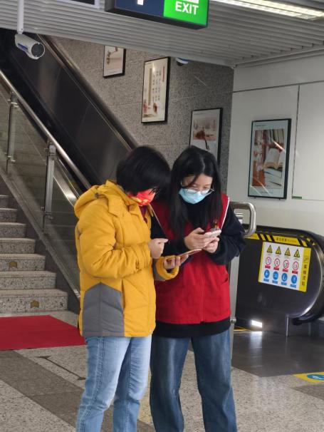 志愿者們幫助不熟悉購(gòu)票流程的旅客進(jìn)行購(gòu)票指引,并為他們規(guī)劃路線,普及相關(guān)的地鐵知識(shí)。