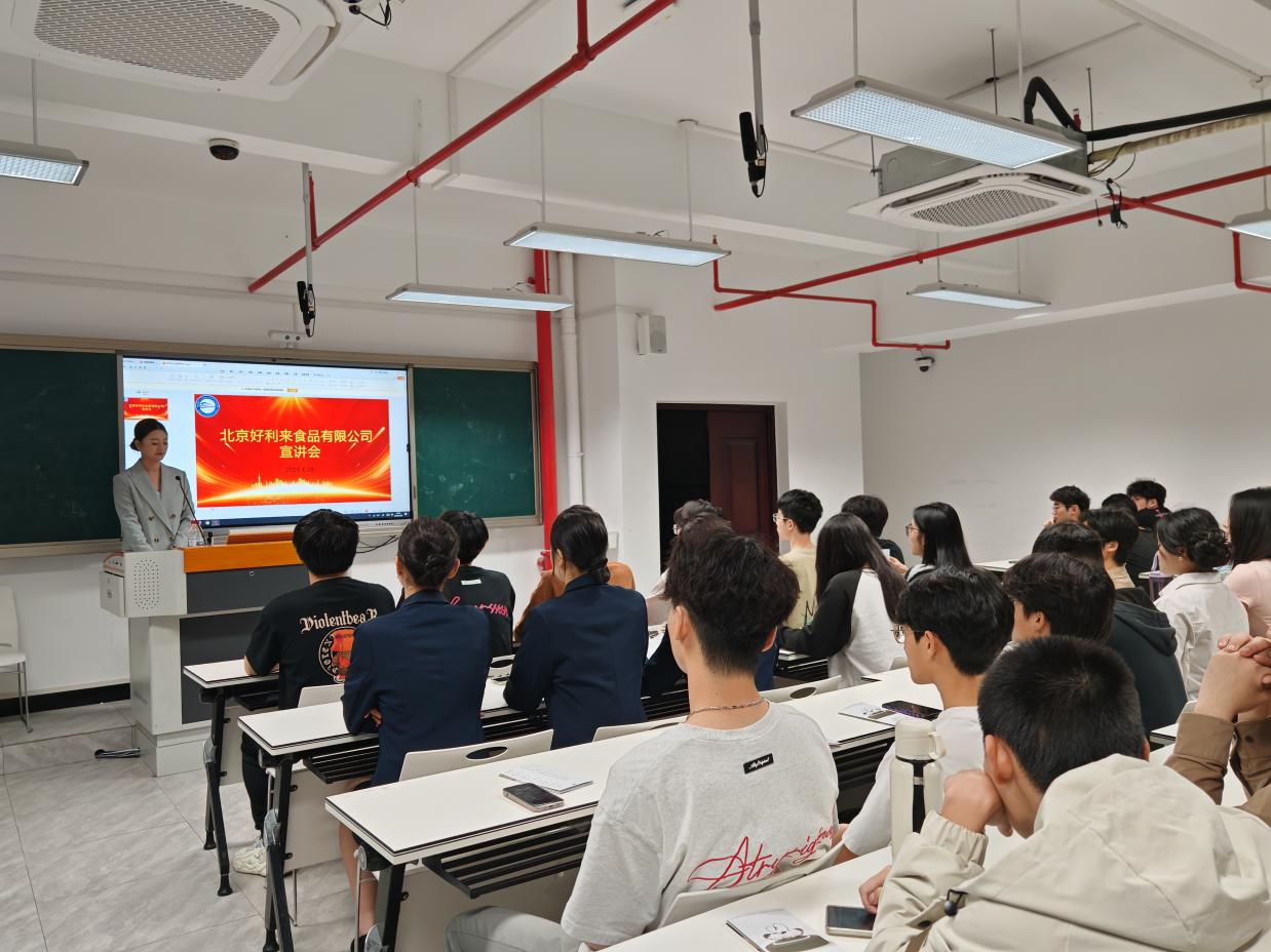 好利來是一家中國知名食品專營連鎖品牌,旗下產品涵蓋面包類、蛋糕類、糕點類、咖啡類。憑借其精美的外觀和優(yōu)質的外觀深受人們喜愛。宣講會上,北京好利來食品有限公司的負責人武文秀向同學們介紹了公司的基本概況、發(fā)展前景、招聘崗位,并展示了公司“用產品和服務感動顧客,為拼搏者提供舞臺”的價值觀,以及完善的員工培訓與晉升體系。針對工資待遇、發(fā)展路徑、培養(yǎng)模式等熱點問題,進行了進一步的答疑解惑,與同學們進行交流討論。