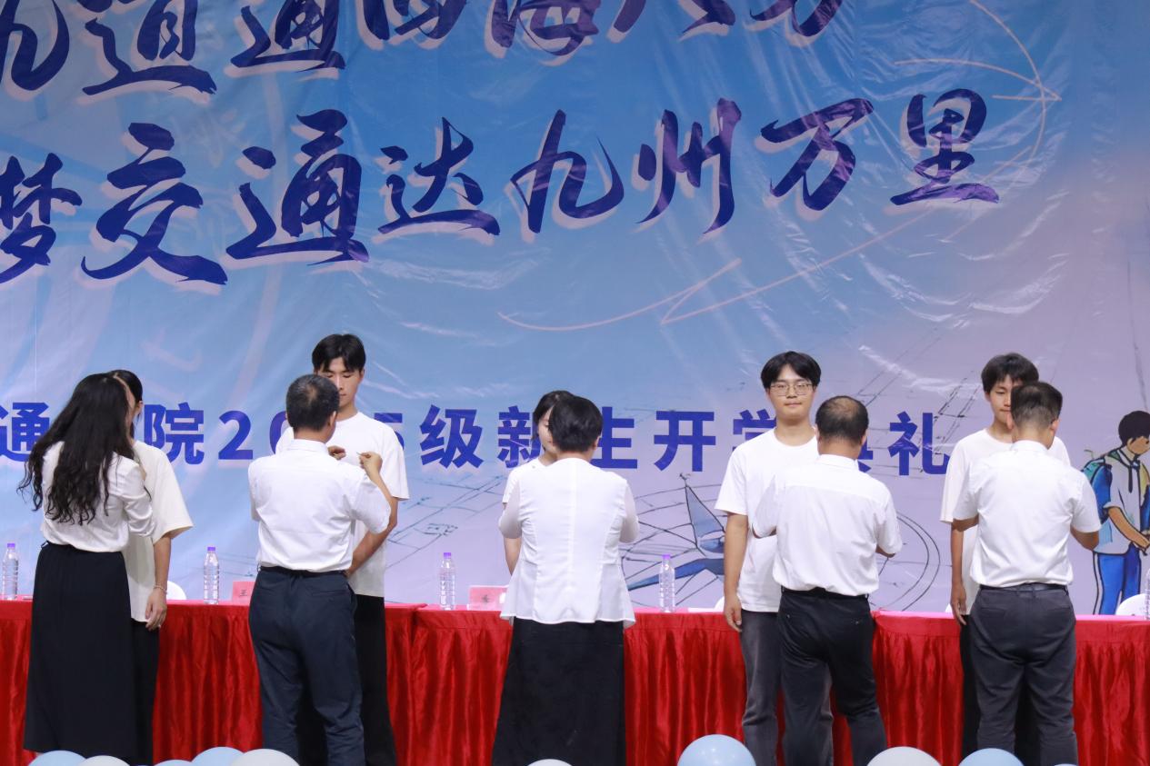 典禮現(xiàn)場最動人的環(huán)節(jié)到來。學院領(lǐng)導與教師代表們手持校徽,逐一為新生佩戴。當小小的校徽別在胸前,不僅是身份的象征,更承載著“傳承船政精神、深耕軌道事業(yè)”的期許。新生們輕輕撫摸徽章,眼中滿是激動與堅定——從這一刻起,他們正式以“船政人”的身份,開啟逐夢之旅。