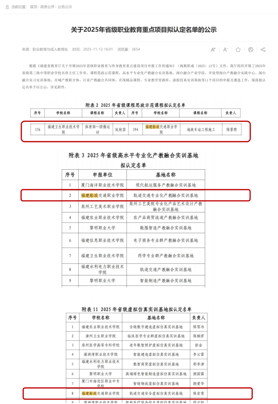 近日,福建省教育廳公布2025年省級職業(yè)教育重點項目擬認定名單,軌道交通學院共有3個重點項目入圍。其中,陳天炎院長牽頭負責的《軌道交通專業(yè)化產教融合實訓基地》被認定為2025年省級高水平專業(yè)化產教融合實訓基地;陳宏意副院長牽頭負責的《軌道交通安全虛擬仿真實訓基地》被認定為2025年省級虛擬仿真實訓基地;陳景煦博士負責的《地鐵車站工程施工》被認定為2025年省級課程思政示范課程。
