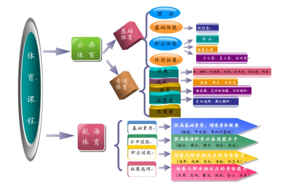 《體育與健康》課程按模塊化設(shè)置,為不同專業(yè)學(xué)生參加技能大賽奠定良好的身體基礎(chǔ)。公共體育開(kāi)設(shè)兩年設(shè)《基礎(chǔ)體育》和《專項(xiàng)體育》。一年級(jí)為《基礎(chǔ)體育》模塊,設(shè)理論部分、基礎(chǔ)體能、職業(yè)體育和拓展選項(xiàng)教學(xué)四個(gè)部分;二年級(jí)開(kāi)設(shè)16門專項(xiàng)選項(xiàng)課程,學(xué)生自主選項(xiàng)。航海體育課程按模塊設(shè)基礎(chǔ)素質(zhì)、水中技能、職業(yè)技能、拓展選項(xiàng)四個(gè)模塊進(jìn)行教學(xué)。