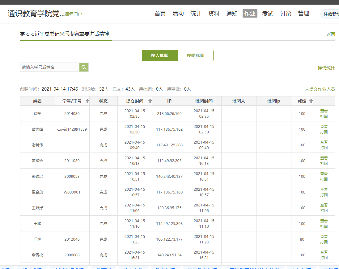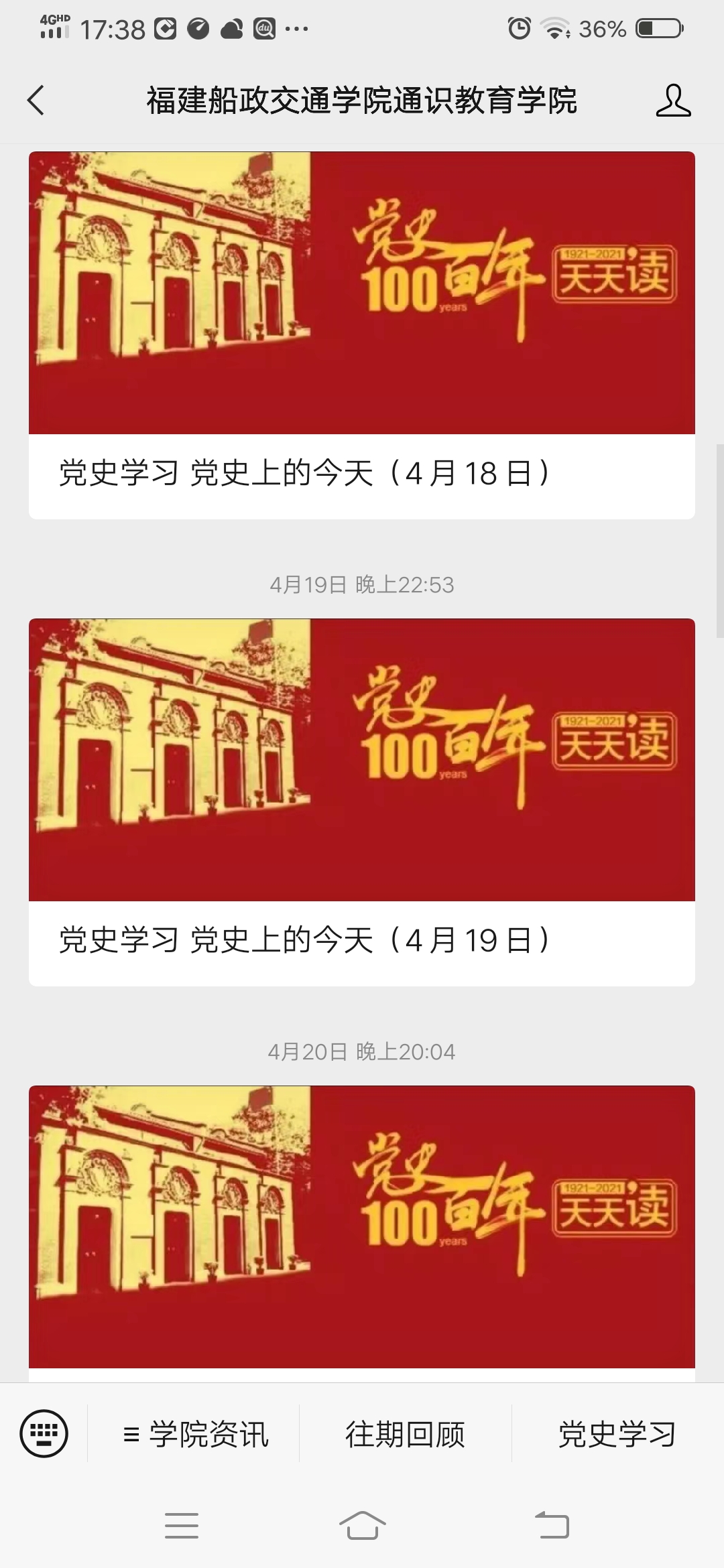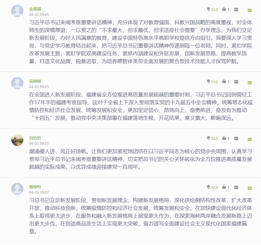 通識(shí)教育學(xué)院黨總支創(chuàng)新黨史學(xué)習(xí)教育形式,利用“學(xué)習(xí)通”線上黨建平臺(tái)的討論和作業(yè)等模塊,開展黨史學(xué)習(xí)教育,以及黨史和習(xí)近平總書記來(lái)閩考察重要講話精神應(yīng)知應(yīng)會(huì)線上測(cè)試,增強(qiáng)學(xué)習(xí)實(shí)效。同時(shí),每日在網(wǎng)頁(yè)和微信公眾號(hào)上推送“黨史上的今天”和黨史學(xué)習(xí)相關(guān)內(nèi)容,通報(bào)總支黨員前日總支“學(xué)習(xí)強(qiáng)國(guó)”積分情況,督促每位教師認(rèn)真學(xué)習(xí)。