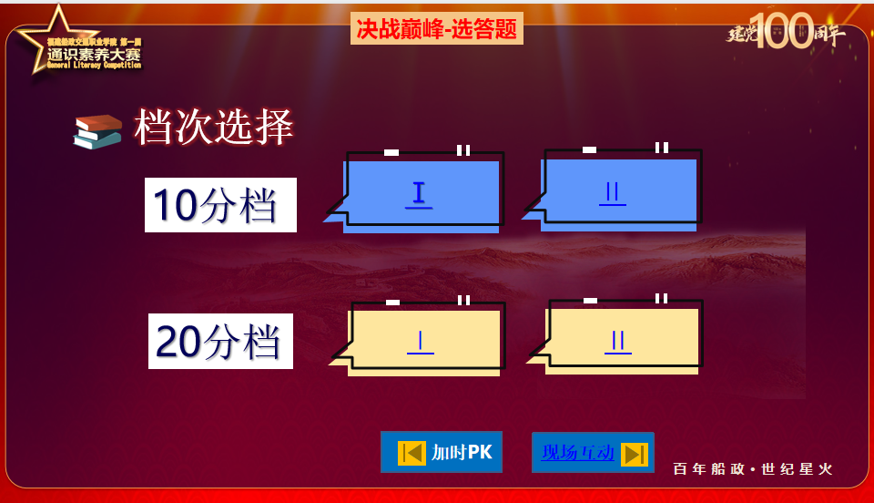 本輪共30題必答題,四支隊伍共同答題。每答對1題加分10分,答錯不扣分。本輪結(jié)束后,根據(jù)積分情況淘汰一支隊伍,剩下三支隊晉級,本輪分?jǐn)?shù)全部清零,每支隊伍各有100分基礎(chǔ)分進(jìn)入下一輪比拼。