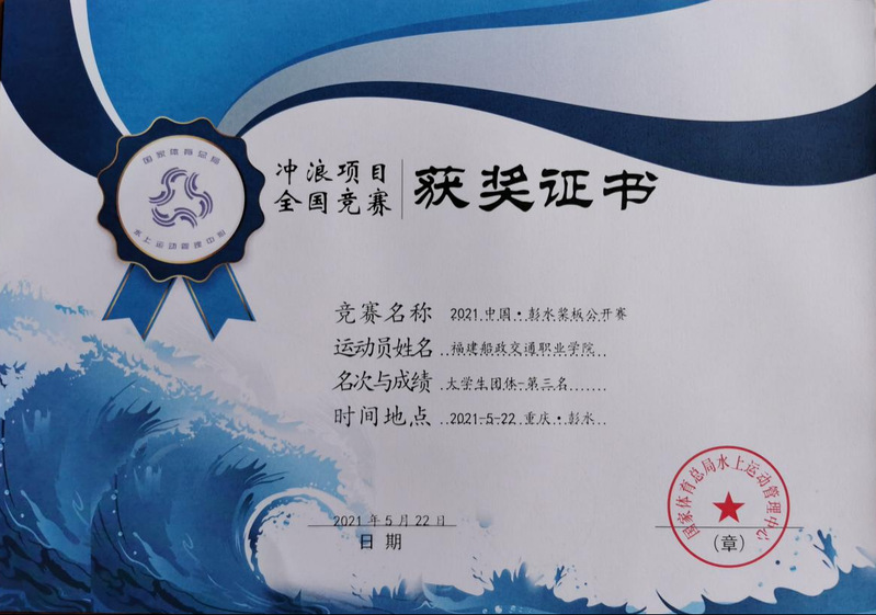 近期,由國家體育總局水上運動管理中心主辦的“第十屆中國?彭水槳板公開賽”在重慶舉行。學(xué)院選派8名學(xué)生組成代表隊首次參賽,全體隊員發(fā)揮不懼壓力、勇于拼搏的精神,共獲得大學(xué)生組5個單項獎,團(tuán)體總分第三名的優(yōu)異成績。