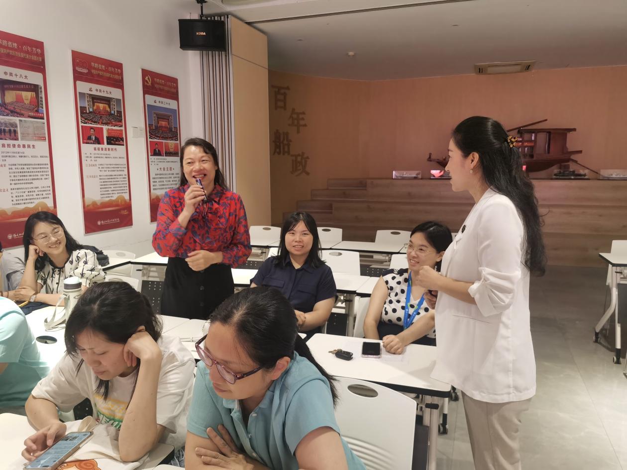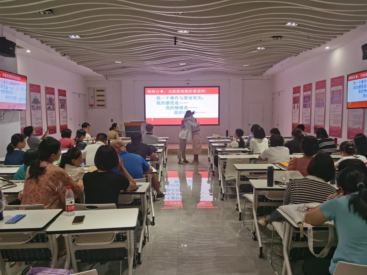 課上,李榕輝老師從教師心理健康出發(fā),結(jié)合生動的案例和自身經(jīng)歷,介紹家庭親子溝通的重要性、意義和途徑,重點闡述了肯定的言詞、精心的時刻、接受禮物、服務(wù)的行動和身體的接觸等“愛的五種語言”,以及具體表達方式?,F(xiàn)場氣氛活躍,李榕輝開展多次互動游戲、測試、冥想母愛之光等活動,有效教師們打開良好溝通之門,提高與家人溝通的質(zhì)量。老師們紛紛表示,培訓課氛圍感好,實用性強,工作離不開家庭,離不開良好的親子關(guān)系,從培訓課中學會了實用親子表達溝通的方式和技巧。