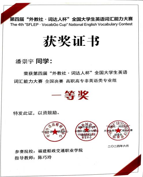 中國(guó)外語(yǔ)戰(zhàn)略研究中心、中國(guó)外語(yǔ)教材與教法研究中心和上海外語(yǔ)教育出版社于2024年3月-5月聯(lián)合啟動(dòng)了第四屆“外教社·詞達(dá)人杯”全國(guó)大學(xué)生英語(yǔ)詞匯能力大賽。我校共有547名選手報(bào)名參賽,其中54位選手晉級(jí)省賽。其中,4月16日舉行的省賽中。我校4位選手分別獲得省一、二、三等獎(jiǎng),潘崇宇和陳瑩瑩同學(xué)代表我校參加了5月25日舉行的全國(guó)總決賽并分別獲得全國(guó)決賽一、二等獎(jiǎng)。