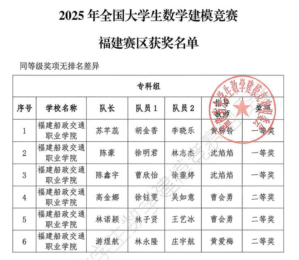 近日,2025年全國大學(xué)生數(shù)學(xué)建模競賽福建賽區(qū)獲獎(jiǎng)名單正式揭曉。福建船政交通職業(yè)學(xué)院學(xué)子再創(chuàng)佳績,共有6支參賽隊(duì)伍全部獲獎(jiǎng),其中一等獎(jiǎng)3項(xiàng)、二等獎(jiǎng)3項(xiàng)。