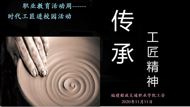 為進(jìn)一步營(yíng)造全社會(huì)關(guān)心支持職業(yè)教育的良好氛圍,積極參與學(xué)院2020年職業(yè)教育活動(dòng)周,校工會(huì)于11月11日周三下午在教職工活動(dòng)中心開展“時(shí)代工匠進(jìn)校園”活動(dòng),特別邀請(qǐng)福建省非物質(zhì)遺產(chǎn)陶瓷藝術(shù)傳承人盧佳倫大師到校開展講座并親自帶領(lǐng)大家感受陶藝文化生活。