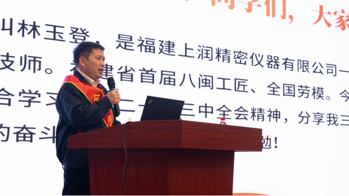 啟動儀式后,全國勞動模范、全國技術(shù)能手、享受國務(wù)院政府特殊津貼專家福建上潤精密儀器有限公司林玉登分享他30年工作的艱辛歷程和生動事跡。他三十年如一日認真做好精密制造這一件事,“簡單的事情重復做,重復的事情堅持做”,他用堅持不懈、永不放棄的精神為推動福建傳統(tǒng)產(chǎn)業(yè)轉(zhuǎn)型升級和智能制造做出了積極貢獻。在場的觀眾都從林玉登勞模事跡中深刻感悟勞模精神、勞動精神、工匠精神的實質(zhì)內(nèi)涵。