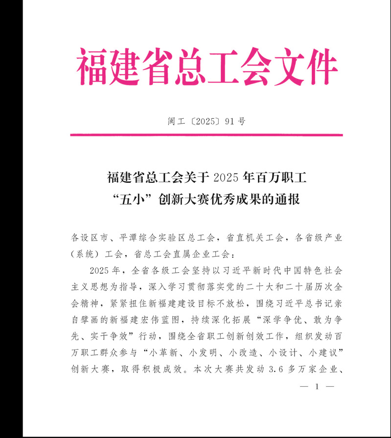 近日,福建省總工會公布《關于2025年百萬職工“五小”創(chuàng)新大賽優(yōu)秀成果的通報》,我院鄒澤昌省級勞模工匠創(chuàng)新工作室報送的創(chuàng)新成果表現(xiàn)優(yōu)異,共斬獲二等獎1項、三等獎4項。