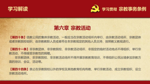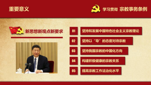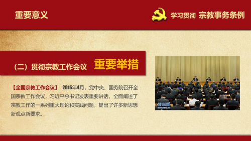 黨的十八大以來,以習近平同志為核心的黨中央高度重視宗教工作,將宗教工作擺上更加重要的議事日程。2016年,黨中央、國務院召開全國宗教工作會議,習近平總書記發(fā)表了重要講話,從黨和國家事業(yè)發(fā)展全局的戰(zhàn)略高度,科學分析了宗教工作面臨的形勢和任務,就宗教問題和宗教工作提出了一系列新思想新觀點新要求,為加強和改進新形勢下的宗教工作指明了方向、提供了遵循。 新修訂的《宗教事務條例》于2018年2月1日正式實施。出臺新修訂的《條例》,是貫徹全國宗教工作會議精神的重要舉措,對推進我國宗教工作法治化進程具有十分重要的意義。