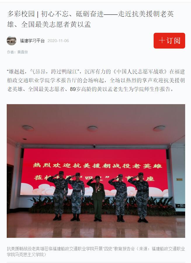 “雄赳赳,氣昂昂,跨過鴨綠江”,沉渾有力的《中國人民志愿軍戰(zhàn)歌》在福建船政交通職業(yè)學(xué)院學(xué)術(shù)報告廳的會場響起,全場以熱烈的掌聲歡迎抗美援朝老英雄、全國最美志愿者、89歲高齡的黃以孟老先生為學(xué)院師生作報告。