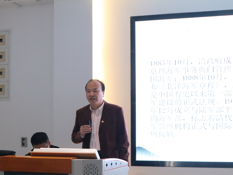 講座中,楊震老師圍繞主題,從船政創(chuàng)辦的背景、船政學(xué)堂對(duì)中國近代海軍的作用、船政輪船水師的作用、船政精神對(duì)現(xiàn)代的啟示四方面分析了船政與中國近代海軍的歷史淵源。他詳細(xì)介紹了船政學(xué)堂的辦學(xué)理念與組成部分,講述了船政辦學(xué)的歷史,列舉了鄧世昌等一批船政學(xué)子為國奮戰(zhàn)的英勇事跡。