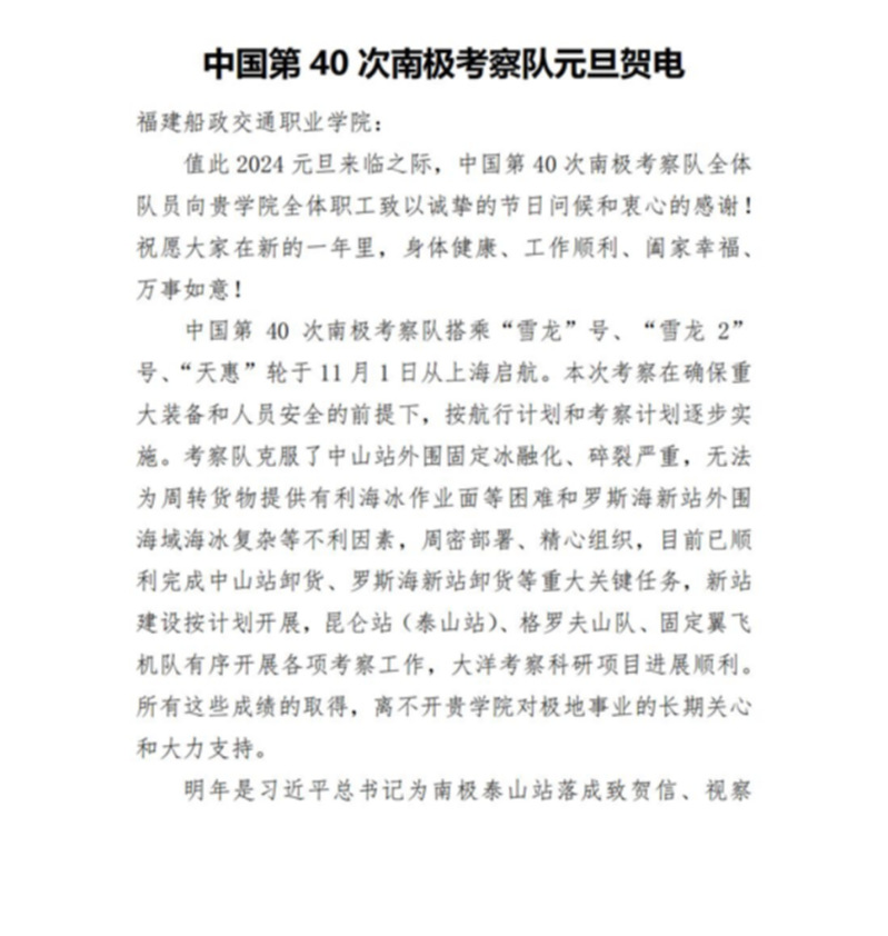 近日,我院收到中國(guó)第40次南極科學(xué)考察隊(duì)發(fā)來的元旦賀電。遠(yuǎn)在南極執(zhí)行考察任務(wù)的中國(guó)第40次南極科學(xué)考察隊(duì)全體隊(duì)員向我院全體職工致以誠(chéng)摯的節(jié)日問候,向我院對(duì)極地事業(yè)的長(zhǎng)期支持和大力關(guān)心表示衷心的感謝。