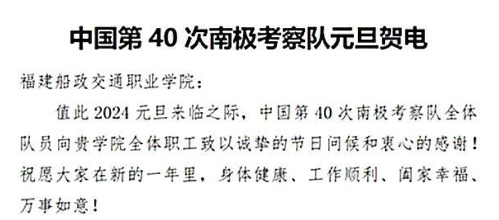 近日,福建船政交通職業(yè)學(xué)院收到中國(guó)第40次南極科學(xué)考察隊(duì)發(fā)來(lái)的元旦賀電,向福建船政交通職業(yè)學(xué)院對(duì)極地事業(yè)的長(zhǎng)期支持和大力關(guān)心表示衷心的感謝。