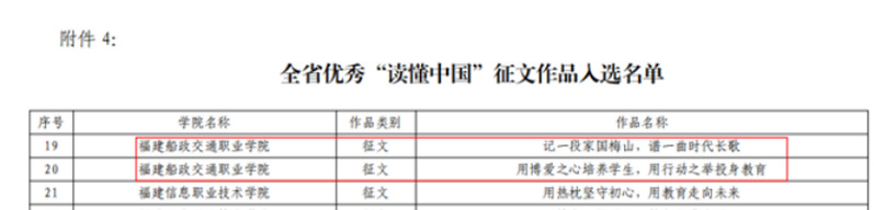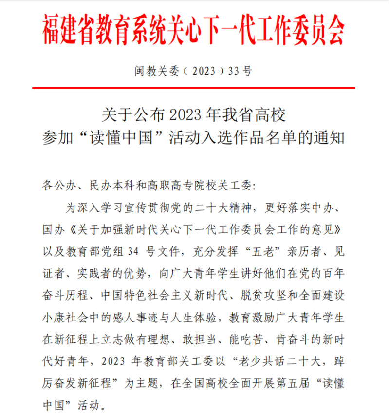 日前,福建省教育系統(tǒng)關(guān)工委公布了2023年我省高校參加“讀懂中國(guó)”活動(dòng)入選作品名單,我院關(guān)工委榮獲全省優(yōu)秀組織獎(jiǎng),微視頻《“船”承人》成功入選全省最佳“讀懂中國(guó)”微視頻作品,《學(xué)習(xí)貫徹二十大,紅色校史砥礪行》榮獲全省優(yōu)秀“讀懂中國(guó)”微視頻作品,2篇學(xué)生征文入選全省優(yōu)秀征文作品。