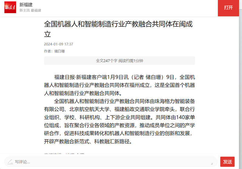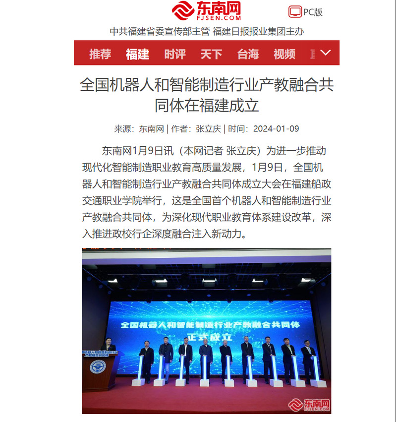 近日,全國(guó)機(jī)器人和智能制造行業(yè)產(chǎn)教融合共同體在我院成立。中國(guó)教育電視臺(tái)、福建日?qǐng)?bào)、新福建、福建教育電視臺(tái)、東南網(wǎng)等多家主流媒體平臺(tái)對(duì)此進(jìn)行集中宣傳報(bào)道。