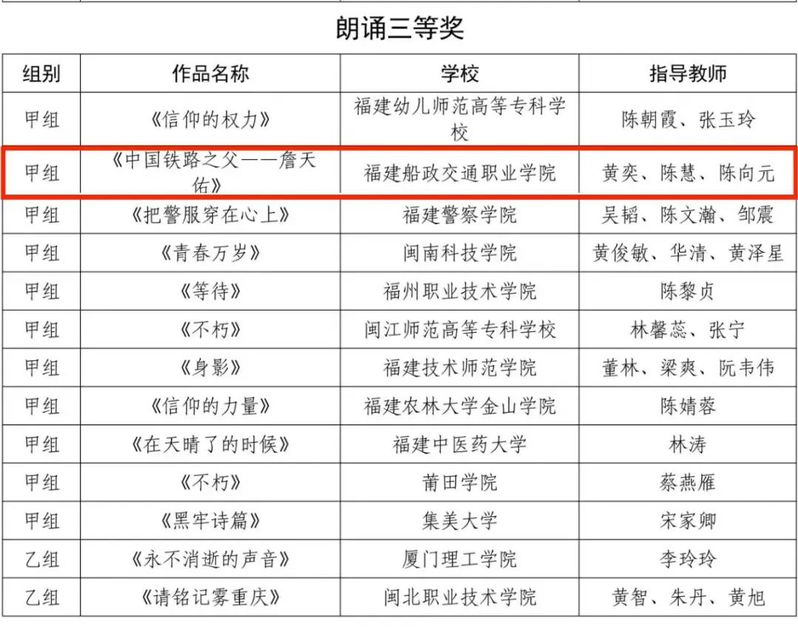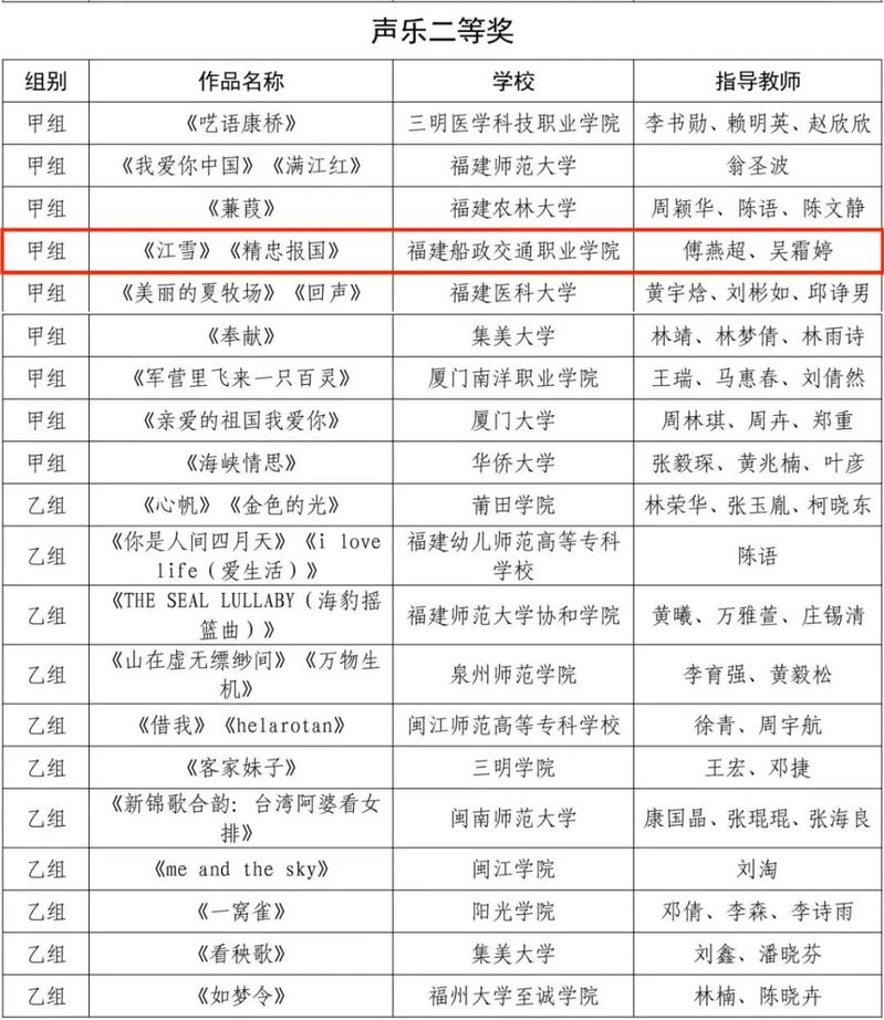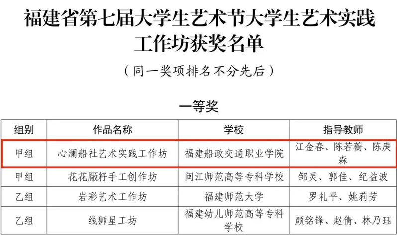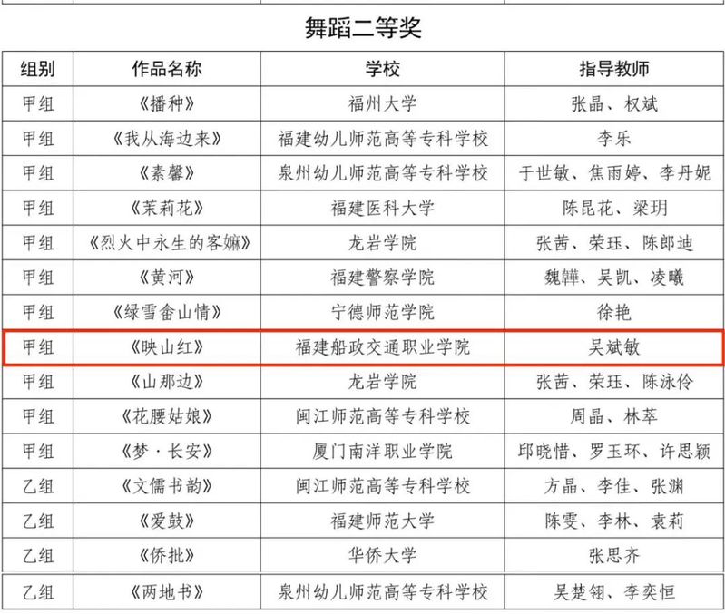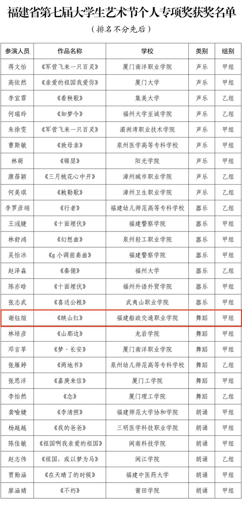 福建省第七屆大學(xué)生藝術(shù)節(jié)展演活動(dòng)獲獎(jiǎng)名單近日公布。大藝展由福建省教育廳主辦,三年舉辦一次,本屆藝術(shù)節(jié)以“厚植家國(guó)情懷,涵養(yǎng)進(jìn)取品格”為主題。我院精心準(zhǔn)備,選送了4個(gè)項(xiàng)目參加福建省第七屆大學(xué)生藝術(shù)節(jié)展演,斬獲6項(xiàng)榮譽(yù),其中一等獎(jiǎng)1項(xiàng)并入圍國(guó)賽角逐,二等獎(jiǎng)2項(xiàng),三等獎(jiǎng)1項(xiàng),學(xué)院榮獲優(yōu)秀組織獎(jiǎng),1位學(xué)生獲個(gè)人專(zhuān)項(xiàng)獎(jiǎng)。