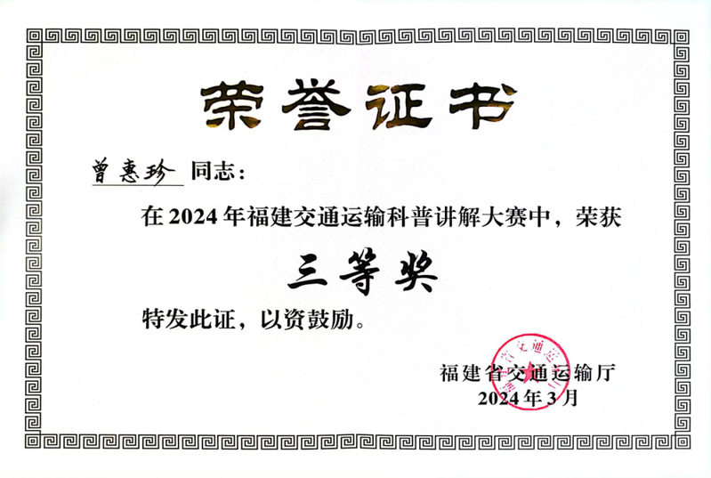 近日,福建省交通運輸廳下發(fā)了《福建省交通運輸廳關(guān)于公布2024年福建交通運輸科普講解大賽獲獎名單的通知》,我院土木工程學院曾惠珍副教授的《探秘懸索橋的工程巧思》科普作品榮獲三等獎。