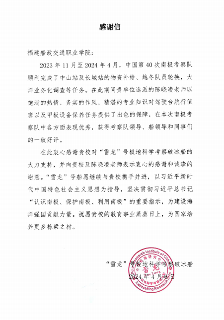 4月15日,“雪龍”號極地科考船順利返航回家,靠泊在位于上海外高橋的中國極地科考國內(nèi)基地碼頭,圓滿完成中國第40次南極考察任務。我院選派陳曉凌老師赴“雪龍”號船,參加了中國第40次南極考察。