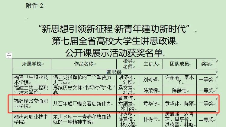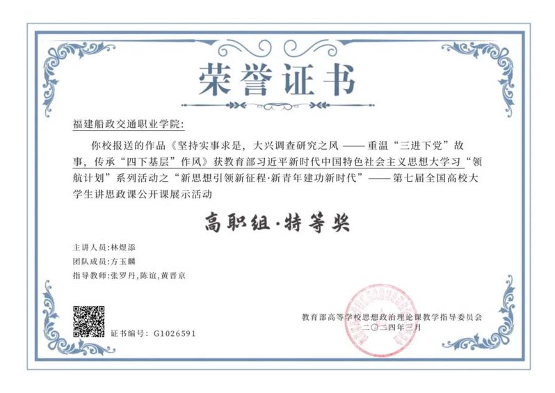 日前,根據(jù)教育部高校思政課教學(xué)指導(dǎo)委員會(huì)和福建省委教育工委的評審結(jié)果,我院選送的作品《堅(jiān)持實(shí)事求是,大興調(diào)查研究之風(fēng)——重溫“三進(jìn)下黨”故事,傳承“四下基層”作風(fēng)》榮獲第七屆全國高校大學(xué)生講思政課公開課展示活動(dòng)高職組特等獎(jiǎng),《從百年船廠蝶變看創(chuàng)新偉力》榮獲第七屆全省高校大學(xué)生講思政課公開課展示活動(dòng)高職組二等獎(jiǎng)。