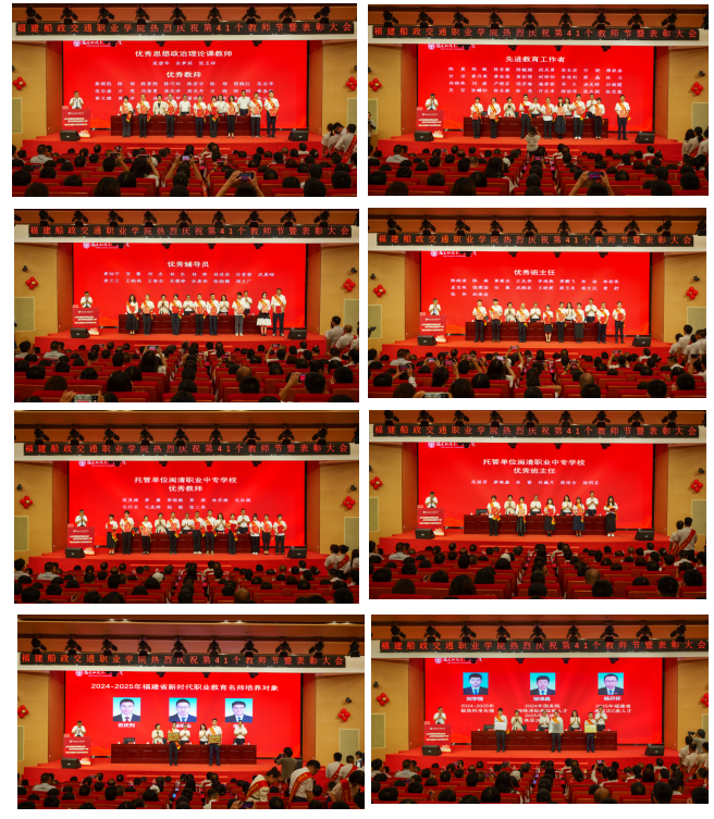 會(huì)議在莊嚴(yán)的國歌聲中拉開序幕。大會(huì)對(duì)2024-2025學(xué)年獲得學(xué)院優(yōu)秀教師、先進(jìn)教育工作者、優(yōu)秀輔導(dǎo)員、優(yōu)秀班主任,福建閩清職業(yè)中專學(xué)校優(yōu)秀教師和優(yōu)秀班主任,享受政府特殊津貼高技能人才、福建省高層次人才、極地科考先鋒,福建省教學(xué)成果獎(jiǎng)特等獎(jiǎng)、一等獎(jiǎng),世界職業(yè)院校技能大賽金獎(jiǎng)指導(dǎo)教師,第二批國家級(jí)教師教學(xué)創(chuàng)新團(tuán)隊(duì),全國樣板支部、全國“雙帶頭人”教師黨支部書記“強(qiáng)國行”專項(xiàng)團(tuán)隊(duì),全國模范職工之家、福建省勞模工匠創(chuàng)新工作室、福建省工匠學(xué)院的個(gè)人和團(tuán)隊(duì)代表進(jìn)行頒獎(jiǎng)。