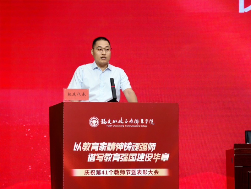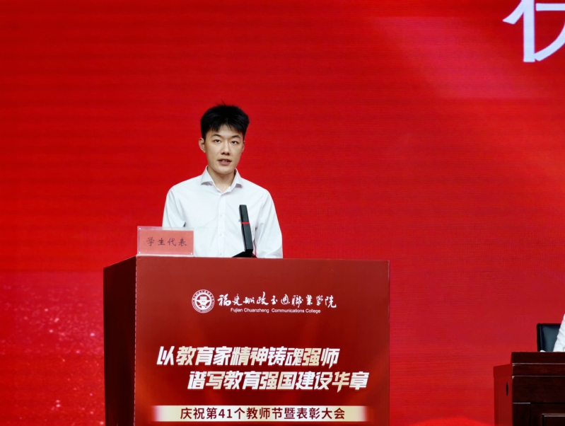 來自安全與環(huán)境學(xué)院24級(jí)安全技術(shù)與管理專業(yè)的劉濱福同學(xué),作為學(xué)生代表為全體教師送上真摯祝福,他分享了自己從軍旅到重返校園的心路歷程,感謝老師們的悉心教導(dǎo),并表示將以更加堅(jiān)定的信念和實(shí)際行動(dòng)回報(bào)師恩、不負(fù)青春。