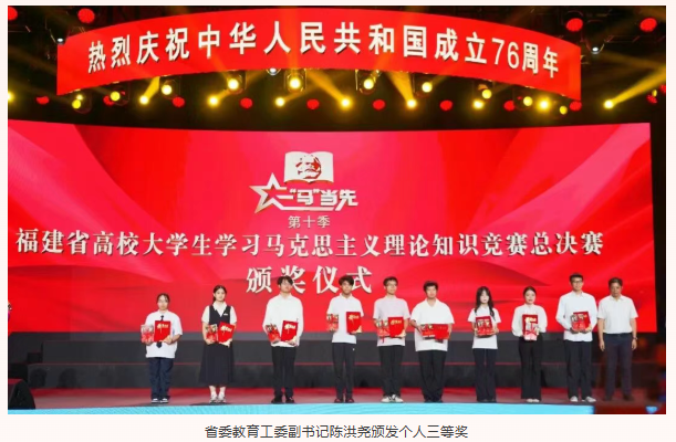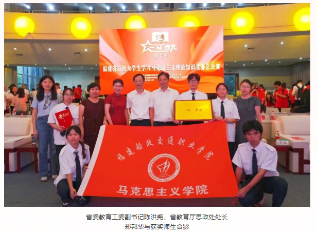 為深入學(xué)習(xí)貫徹習(xí)近平總書(shū)記關(guān)于學(xué)校思政課建設(shè)的重要指示精神,貫徹落實(shí)全國(guó)、全省教育大會(huì)精神,堅(jiān)持不懈用習(xí)近平新時(shí)代中國(guó)特色社會(huì)主義思想鑄魂育人,9月27日,由中共福建省委宣傳部、中共福建省委教育工委主辦,福建省高校思想政治理論課教學(xué)指導(dǎo)委員會(huì)、福建教育電視臺(tái)承辦的第十季福建省高校大學(xué)生學(xué)習(xí)馬克思主義理論“一‘馬’當(dāng)先”知識(shí)競(jìng)賽總決賽在福建農(nóng)林大學(xué)成功舉辦。我院黨委書(shū)記陳宜大攜師生代表參與活動(dòng)。