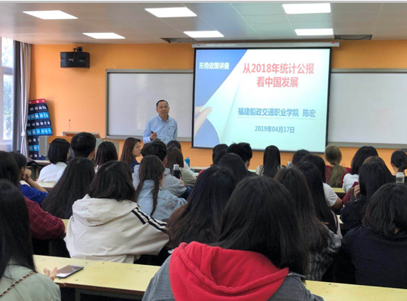 為貫徹落實《中共福建省委教育工委關(guān)于進(jìn)一步規(guī)范高校形勢與政策課教育教學(xué)工作的通知》(閩委教思〔2017〕13 號)指出,“高校黨委書記、校長和院(系)黨組織書記、院長(系主任)每學(xué)期至少為學(xué)生作一次形勢政策報告”。根據(jù)《教社科廳函〔2019〕9號教育部辦公廳關(guān)于印發(fā)<高校“形勢與政策”課教學(xué)要點(2019年上輯)>的通知》,交通經(jīng)濟(jì)系主任于2019年4月17日15:50在31#307教室為交通經(jīng)濟(jì)系會計專業(yè)學(xué)生做了一場題為“從2018年統(tǒng)計公報看中國發(fā)展”的主題報告。報告上陳宏主任從十九大報告不忘初心,牢記使命,高舉中國特色社會主義偉大旗幟,決勝全面建成小康社會,奪取新時代中國特色社會主義偉大勝利,為實現(xiàn)中華民族偉大復(fù)興的中國夢不懈奮斗。中國共產(chǎn)黨人的初心和使命,就是為中國人民謀幸福,為中華民族謀復(fù)興。