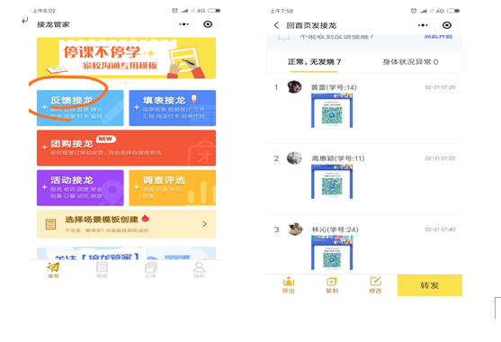 交通經(jīng)濟(jì)系張美嬋老師推薦了微信“接龍管家”,點(diǎn)擊所需的模板,即可在相關(guān)微信群一鍵發(fā)布疫情篩查上報內(nèi)容,將學(xué)生目前是否在家,是否發(fā)燒,是否接觸武漢等疫情高發(fā)地人員,近期是否返榕等文字反饋信息與閩政通八閩健康碼的截圖反饋輕松結(jié)合,讓學(xué)生遵照模板填寫。