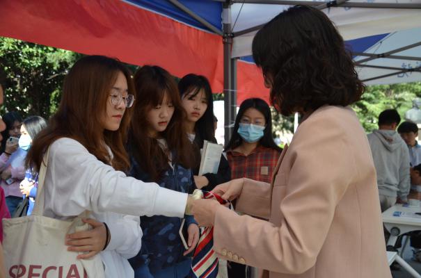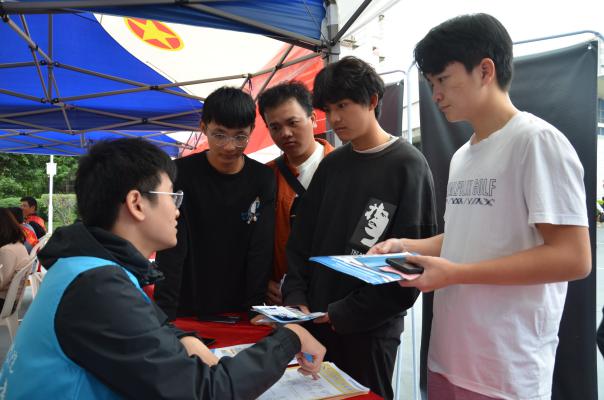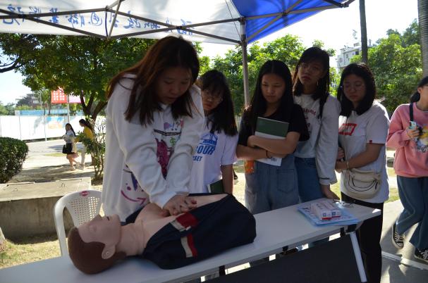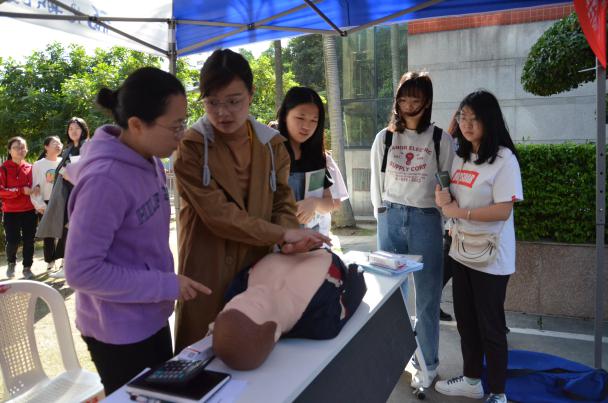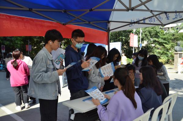 活動現(xiàn)場,老師和志愿者們通過分發(fā)金融知識宣傳單和手把手教學(xué)的形式,為來往的同學(xué)介紹普及日常生產(chǎn)生活所必要的金融基礎(chǔ)知識、禮儀知識、急救知識,同學(xué)們或在宣傳板前駐足觀看,或向志愿者咨詢問題,現(xiàn)場科普氛圍濃烈。