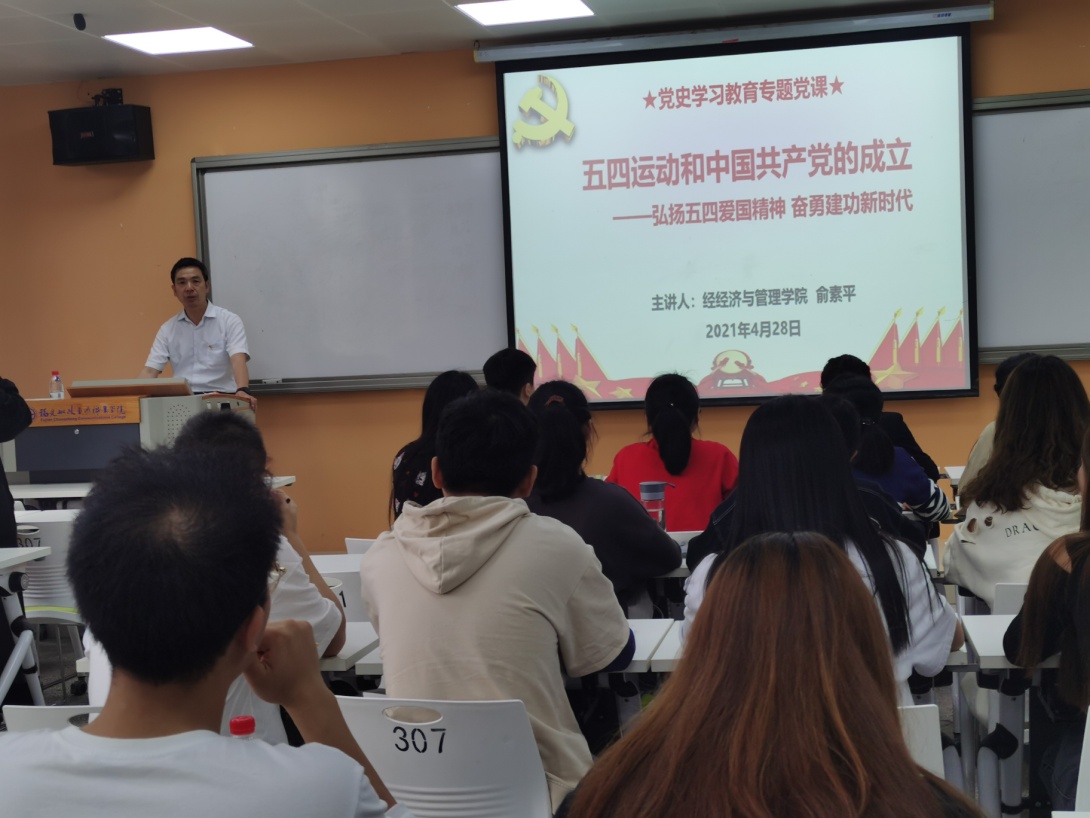 為持續(xù)深入推進(jìn)黨史學(xué)習(xí)教育和“再學(xué)習(xí)、再調(diào)研、再落實”活動,4月29日下午,經(jīng)濟(jì)與管理學(xué)院黨總支俞素平書記在南區(qū)31號樓307教室作題為“弘揚五四愛國精神 奮勇建功新時代”的黨史學(xué)習(xí)教育專題黨課。學(xué)院全體輔導(dǎo)員和學(xué)生黨員發(fā)展對象參加了此次黨史學(xué)習(xí)講座。