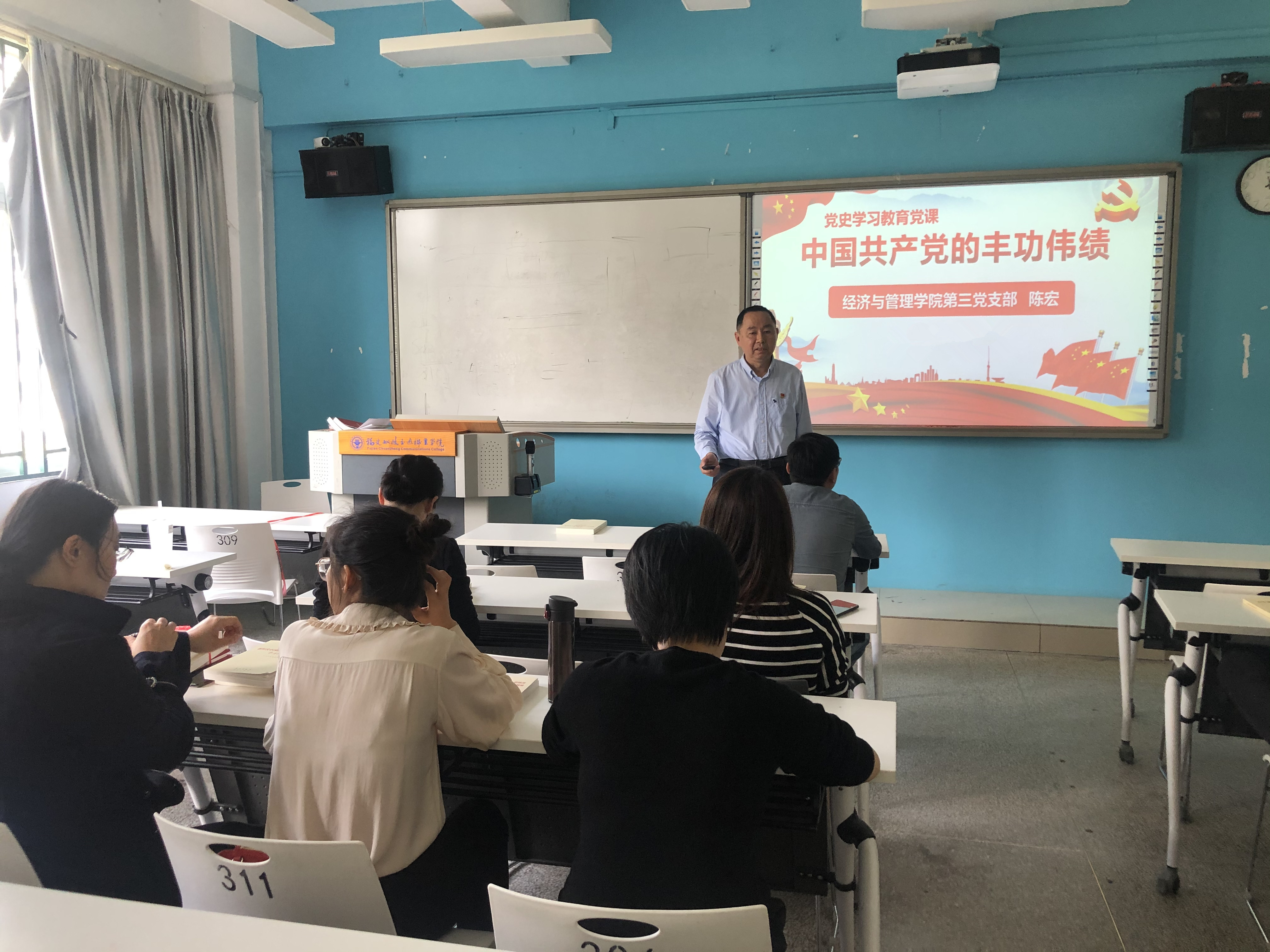 習(xí)近平總書記指出,歷史是最好的教科書,中國革命歷史是最好的營養(yǎng)劑。學(xué)習(xí)黨史、國史,是堅(jiān)持和發(fā)展中國特色社會(huì)主義,把黨和國家各項(xiàng)事業(yè)繼續(xù)向前推進(jìn)的必修課。為從黨的百年偉大奮斗歷程中汲取繼續(xù)前進(jìn)的智慧和力量,激勵(lì)老師進(jìn)一步強(qiáng)化黨性修養(yǎng),增強(qiáng)做好教育教學(xué)工作的使命擔(dān)當(dāng),經(jīng)濟(jì)與管理學(xué)院第三黨支部結(jié)合黨史學(xué)習(xí)教育開展支部書記上黨課、講黨史活動(dòng)。