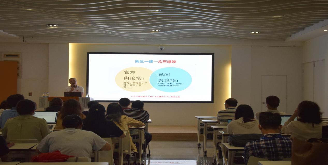 為深入學習貫徹習近平總書記關(guān)于宣傳思想工作的重要思想,嚴格落實意識形態(tài)工作責任制,進一步提升我院教師媒介素養(yǎng)和輿情處置能力,6月15日上午,我院舉辦意識形態(tài)工作專題培訓,《中國青年報》高級記者陳強應(yīng)邀作題為《網(wǎng)絡(luò)輿情與危機應(yīng)對》專題授課。院黨政領(lǐng)導(dǎo)班子、教研室主任、支部委員、部分專任教師、全體輔導(dǎo)員參加此次培訓。培訓由黨總支副書記林麗萍主持。