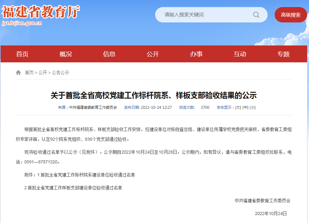 近日,中共福建省委教育工作委員會公布首批全省高校黨建工作標(biāo)桿院系、樣板支部驗收評估情況,我院第三黨支部順利通過“福建省高校黨建工作樣板支部”驗收。