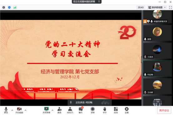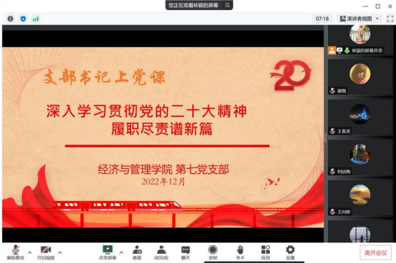 12月1日經(jīng)濟(jì)與管理學(xué)院第七黨支部書記林穎同志在線給支部黨員上了一堂題為“深入學(xué)習(xí)貫徹黨的二十大精神履職盡責(zé)譜新篇”的黨課。