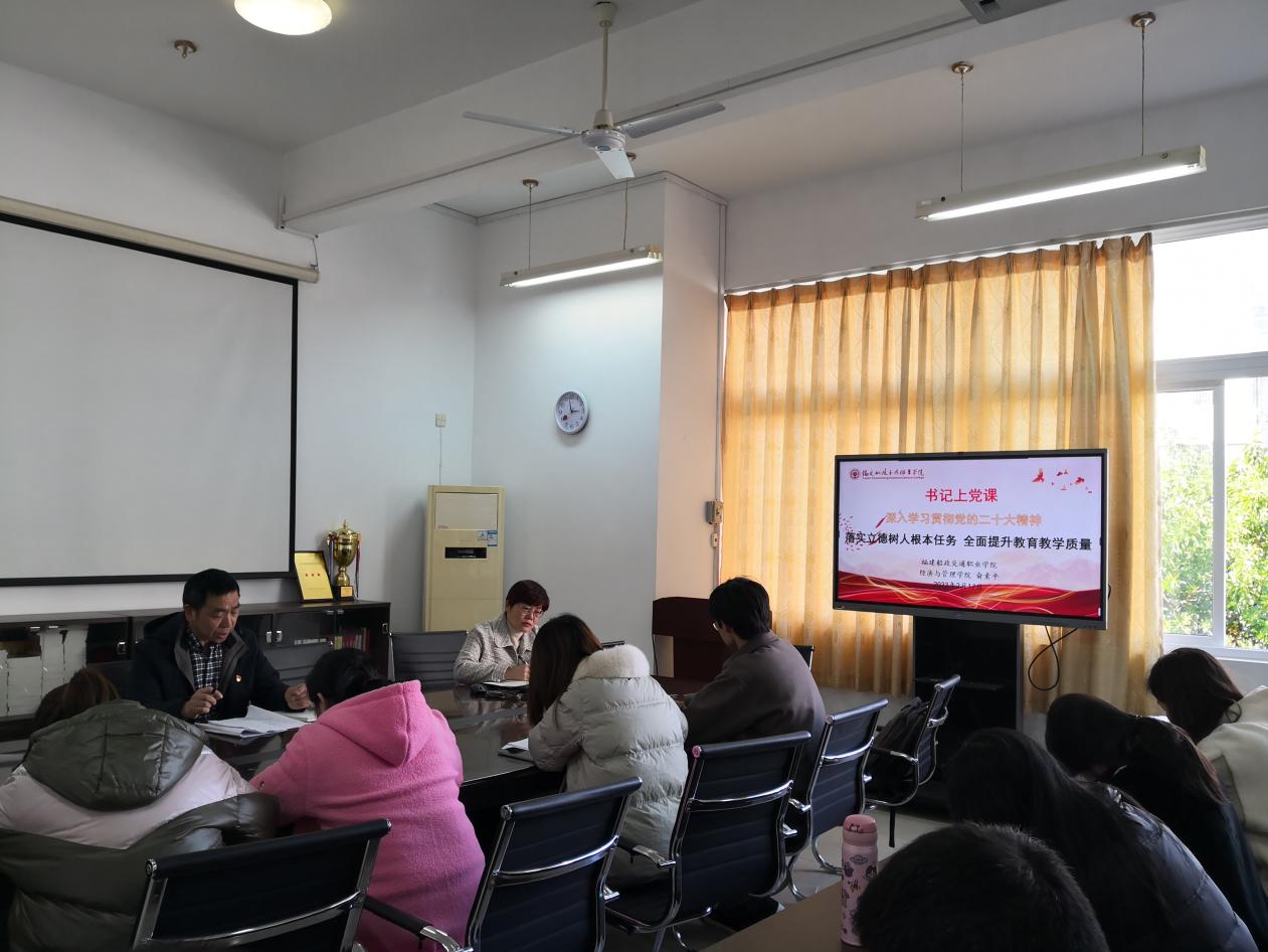 為深入學(xué)習(xí)貫徹黨的二十大精神,堅持不懈用習(xí)近平新時代中國特色社會主義思想凝心鑄魂,凝聚團結(jié)奮進的精神力量,推動學(xué)院教育事業(yè)高質(zhì)量發(fā)展,2023年2月17日,經(jīng)濟與管理學(xué)院黨總支書記俞素平于31#412會議室開展書記上黨課之黨的二十大精神專題宣講活動。經(jīng)濟與管理學(xué)院第一、二黨支部全體師生黨員通過線上、線下相結(jié)合的方式參加了此次活動。