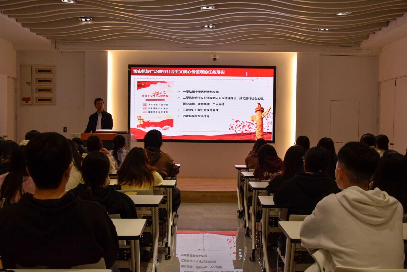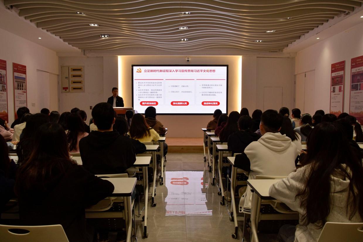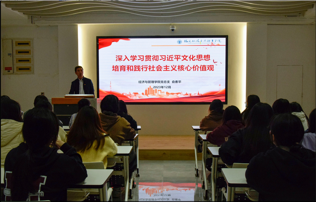 為深入學(xué)習(xí)貫徹黨的二十大精神,推進(jìn)學(xué)習(xí)貫徹習(xí)近平新時(shí)代中國(guó)特色社會(huì)主義思想主題教育走深走實(shí),12月13日,經(jīng)濟(jì)與管理學(xué)院黨總支書記俞素平以《深入學(xué)習(xí)貫徹習(xí)近平文化思想 培育和踐行社會(huì)主義核心價(jià)值觀》為題,在黨建館開展形勢(shì)與政策宣講。經(jīng)濟(jì)與管理學(xué)院2022級(jí)第三批入黨積極分子參加了此次宣講會(huì)。